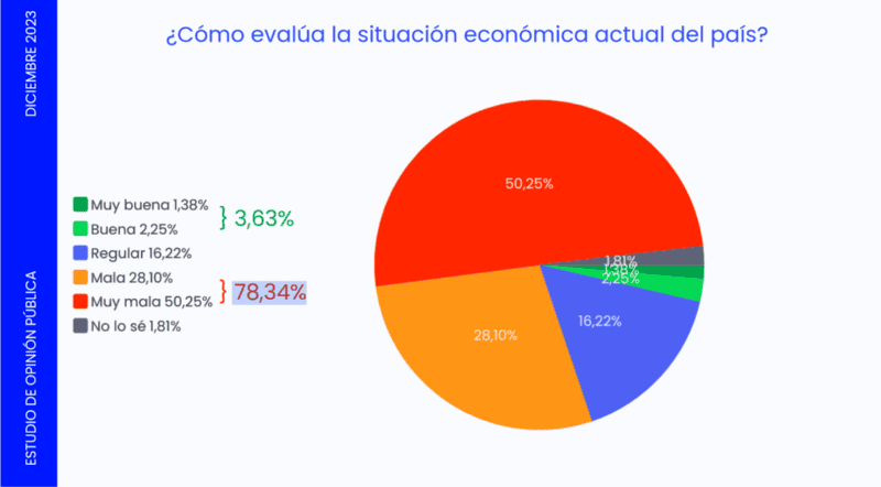 La primera pregunta refirió al nivel de satisfacción con respecto a la situación general del país y sus expectativas frente al gobierno de Javier Milei. La mayoría de los encuestados (un 76%) se mostró muy insatisfecho, frente al 17% que dijo estar en acuerdo, con la condición actual de Argentina. En porcentajes similares se evaluó el estado de la economía nacional que hereda Javier Milei: un 78% la ve mal o muy mal y solo un 3,6% entiende lo contrario.