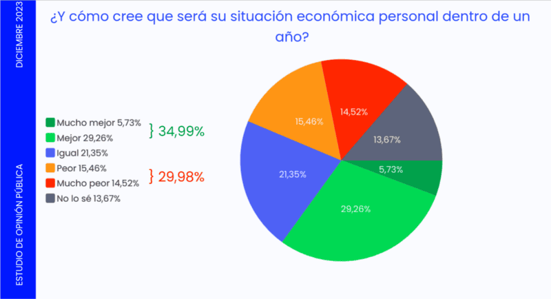 Respecto a cómo se piensa que estará el país dentro de un año, los dos tercios mayoritarios se reparten entre los quienes creen que será mejor (32%) y aquellos que piensan que irá para peor (31%). Donde no se ven equivalencias es en relación con la situación personal de los encuestados: el 61% se percibe en peores condiciones que hace un año, frente al 11% que se identifica mejor.