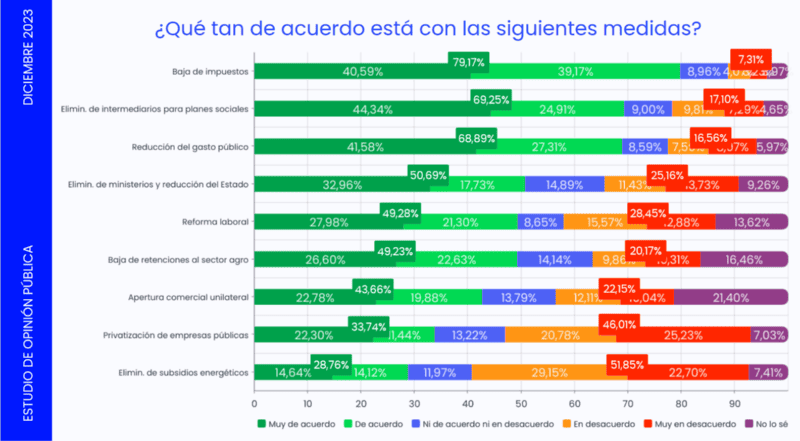 Al ser consultados por el nivel de acuerdo sobre una serie de medidas a las que Javier Milei se refirió en campaña, algunas respuestas llamaron la atención. Dos ejemplos: la eliminación de subsidios a la energía –realidad que comenzará a regir a partir del 1 de enero– y la privatización de empresas públicas. En los dos temas el desacuerdo va del 52 al 46%. No obstante, un 80% coincide en que se debería bajar impuestos y cerca del 70 cree que se debe reducir el gasto público, pese a que el plan de ajuste contempla la suba de tributos (el proyecto para subir ganancias y retenciones lo atestiguan) y que el único ministerio que tiene vía libre para gastos es el Ministerio de Capital Humano.