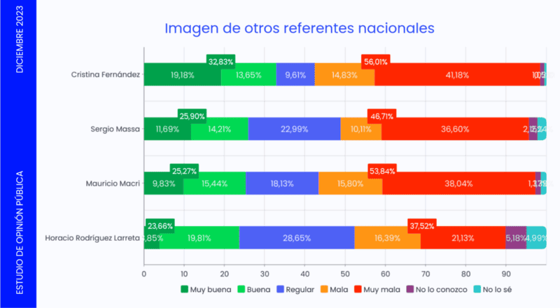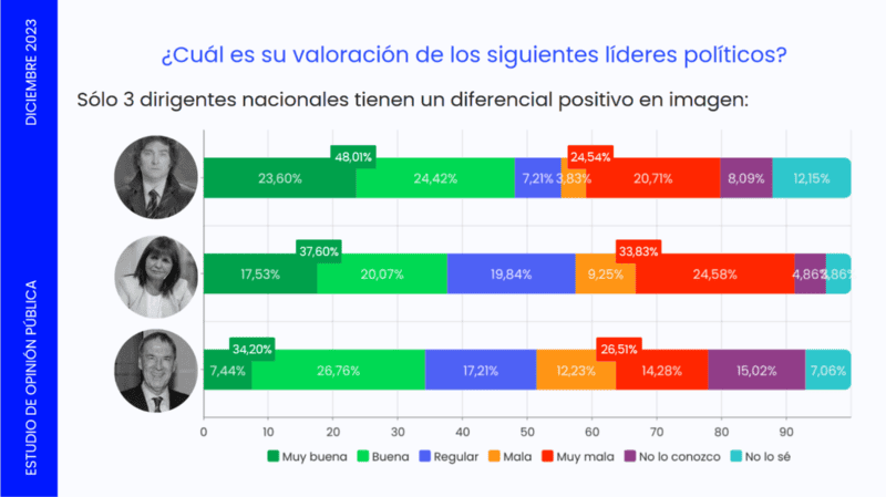 Entre los líderes políticos con mejor imagen aparecen Javier Milei en primer lugar, Patricia Bullrich en segundo y Juan "El gringo" Schiaretti completa el podio. Entre los peores pica en punta Cristina Fernández, seguida por Sergio Massa y Mauricio Macri.