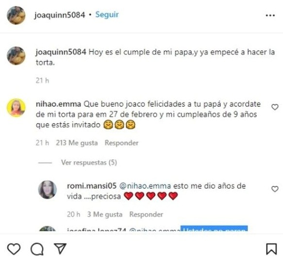“Hoy es el cumple de mi papá y ya empecé a hacer la torta”, escribió el pequeño en la red social, a lo que una nena de tan solo 8 años contestó: “Qué bueno Joaco, felicidades a tu papá y acordate de mi torta para el 27 de febrero y mi cumpleaños de 9 años que estás invitado”.