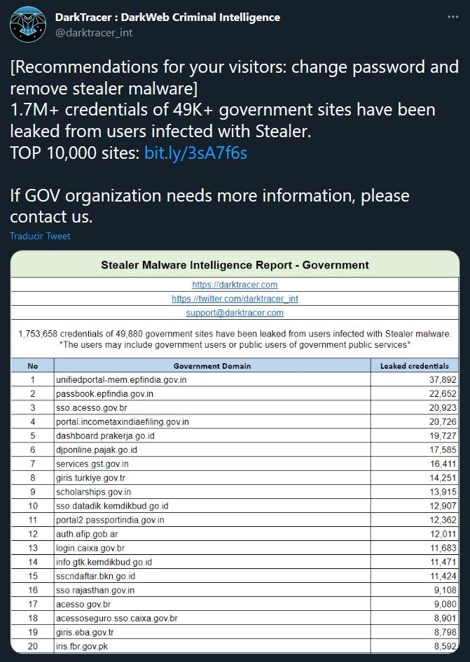 La empresa de ciberseguridad con base en Singapur Dark Tracer, especializada en monitorear la Deep Web en busca de filtraciones de seguridad, informó que más de 1,7 millones de credenciales de acceso de más de 49.000 sitios web gubernamentales alrededor del mundo fueron filtradas de usuarios infectados con un malware.