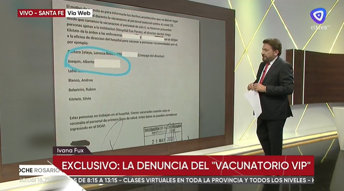 Un documento difundido este miércoles en el programa Telenoche Rosario (El Tres) contiene los nombres de las personas que presuntamente habrían sido privilegiadas en el “vacunatorio VIP” del hospital Eva Perón de Grandera Baigorria.