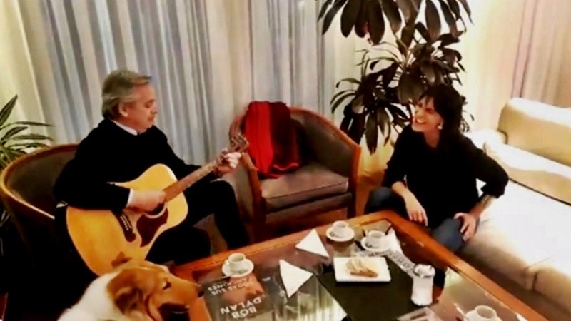 Fernández en guitarra y De La Sota como voz principal, interpretaron “Sólo se trata de vivir”, del músico rosarino, en casa del candidato y ante la mirada atenta de Dylan, el perro de Alberto.