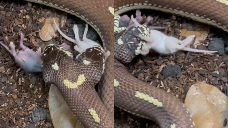 "Así que mi serpiente de dos cabezas, Ben y Jerry, están comiendo ahora mismo", relató Brian Barczyk, cuidador del reptil, mientras muestra como las dos cabezas ingieren dos ratones muertos. "En realidad, no siempre comen al mismo tiempo, pero en este caso ambos están comiendo, de cada lado", agregó.