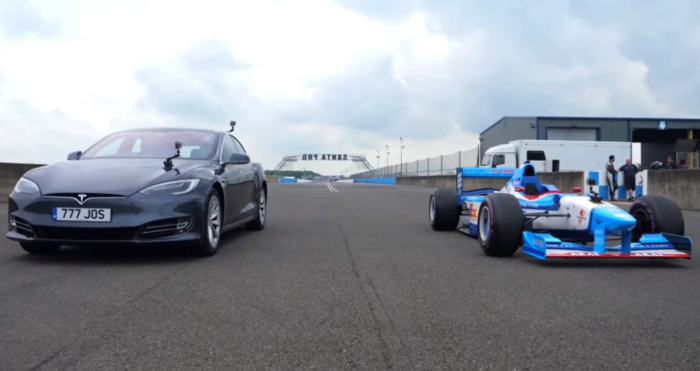 En el arranque, el Model S saca ventaja gracias a su torque instantáneo, pero a los 400 metros del cuarto de milla la situación se da vuelta y el Benetton toma al delantera. El F1 terminó cruzando la meta en 9,6 segundos, mientras que el Tesla lo hizo en 10,8.