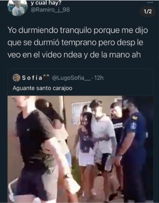 "Yo durmiendo tranquilo porque me dijo que se durmió temprano pero después la veo en el video y de la mano", escribió en su cuenta de Twitter Ramiro Benítez, el novio traicionado que compartió la grabación y se refirió a la actitud de la chica.