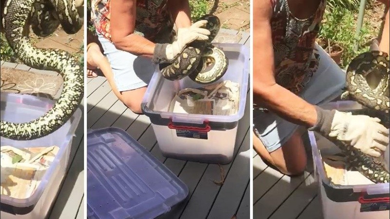 El hecho ocurrió en Queensland, Australia, donde logró meter una pitón de tres metros, aunque el reptil se resistió por varios minutos, intentando enrollarse alrededor de su brazo.