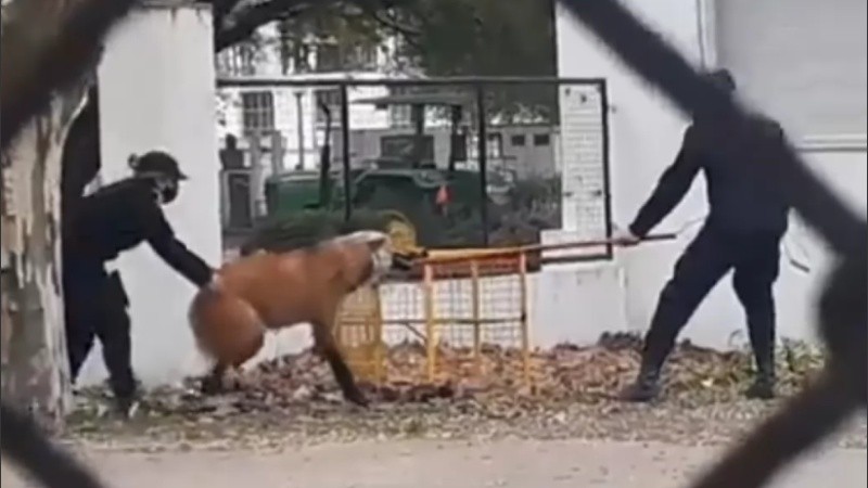 Una vez rescatado en la jaula, los uniformados procedieron a taparla con una manta para que el Aguará Guazú no se estrese, según publicó el diario digital 11 Noticias.