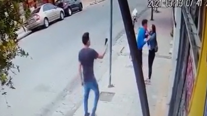 La joven lo sujeta de la campera, mientras es grabado por un amigo con un teléfono celular. La chica agrede al dueño del teléfono con una botella que toma de un canasto de basura.