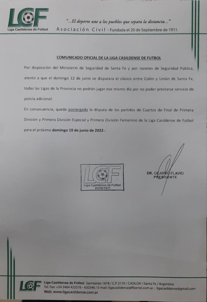 “Por razones de seguridad pública, el día domingo venidero no se prestará servicio de policía adicional. Esto responde a que ese día se desarrollará el evento deportivo denominado "clásico santafesino" entre los clubes Colón y Unión de esta ciudad, lo que consumirá los recursos disponibles", expresó el comunicado de la Dirección Provincial de Prevención y Seguridad en Espectáculos Deportivos y Eventos Masivos, dependiente de la cartera de seguridad santafesina.