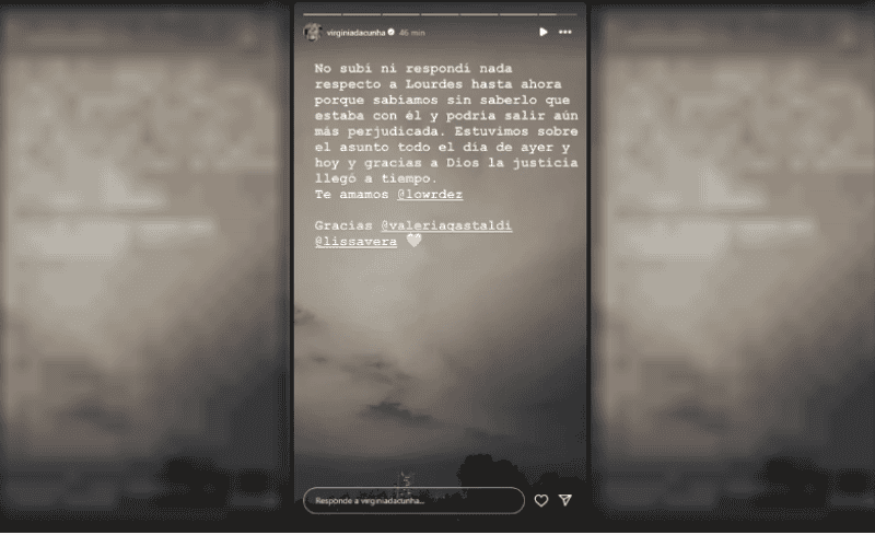 Este jueves por la madrugada y tras una segunda intervención de la Justicia, pudieron encontrar a Lourdes Fernández, la ex cantante de Bandana que se encontraba bajo violencia de género. En ese contexto, Virginia da Cunha escribió en redes sociales y explicó los motivos por los que guardó silencio hasta ahora.