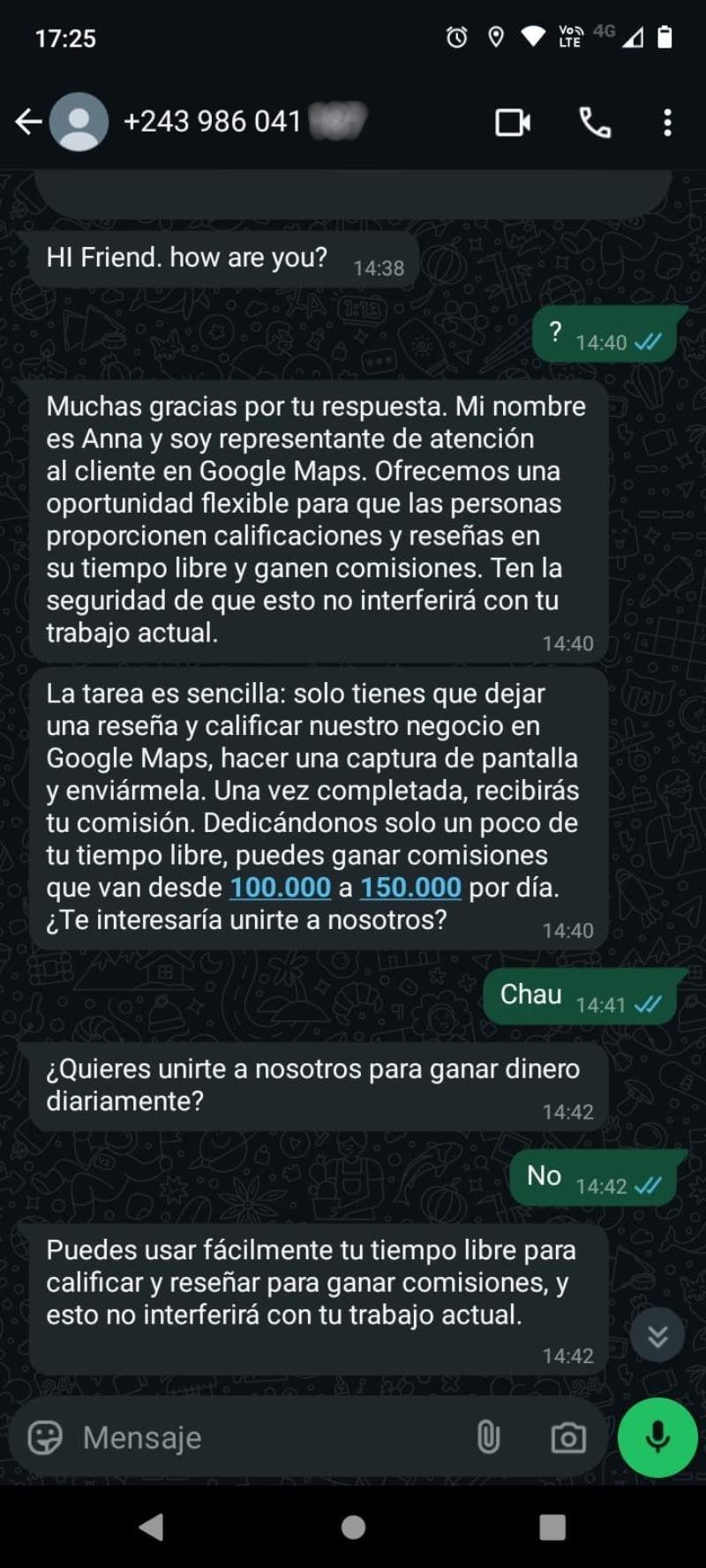 Y amplían: “La tarea es sencilla: solo tienes que dejar una reseña y calificar nuestro negocio en Google Maps, hacer una captura de pantalla y enviármela. Una vez completada, recibirás tu comisión. Dedicándonos solo un poco de tu tiempo libre, puedes ganar comisiones que van desde 100.000 a 150.000 por día. ¿Te interesaría unirte a nosotros para ganar dinero diariamente?”.