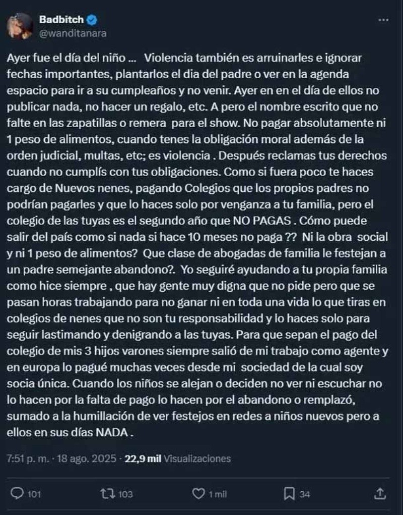 Wanda Nara volvió a encender la polémica con Mauro Icardi. Este domingo se celebró el Día del Niño en Argentina y la mediática compartió un fuerte mensaje en su cuenta oficial de X en el que cuestionó al delantero por su rol como padre.