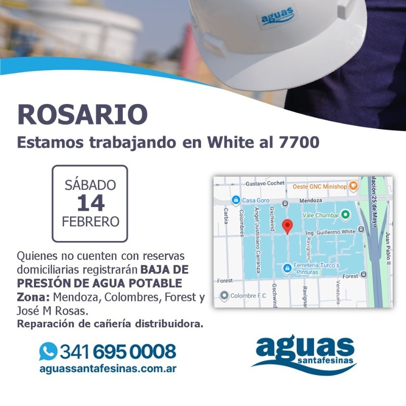En la zona noroeste, las tareas se concentran en la reparación de una cañería distribuidora en White al 7700. Por ese motivo, los usuarios que no cuenten con reservas domiciliarias podrían experimentar baja presión en el área delimitada por Mendoza, Colombres, Forest y José María Rosa.