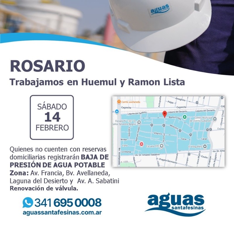 Aguas Santafesinas (Assa) informó que durante este sábado 14 de febrero se registrará baja presión de agua en sectores del noroeste y sudoeste de Rosario debido a trabajos programados en la red de distribución.