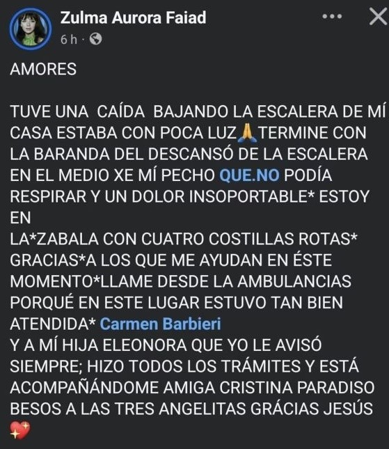 “Tuve una caída bajando la escalera de mi casa, estaba con poca luz. Terminé con la baranda del descanso de la escalera en el medio de mi pecho, que no podía respirar y un dolor insoportable”, relató Faiad que continúa internada y en observaciones, acompañada de su hija Elenora Guerrero.