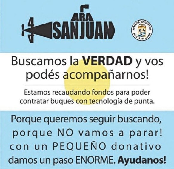 Los familiares de los tripulantes del submarino ARA San Juan, desaparecido desde el 15 de noviembre, comenzaron una campaña para recaudar fondos con el objetivo de contratar embarcaciones privadas equipadas con la tecnología necesaria para realizar la búsqueda.