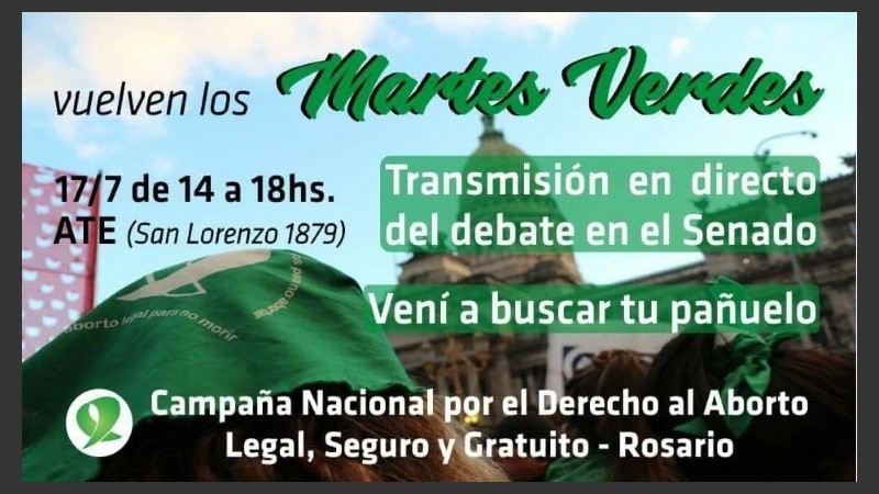 En Rosario, se reeditarán los martes verdes que acompañaron las exposiciones previas a la sesión de Diputados. La Campaña Nacional por el Aborto Legal, Seguro y Gratuito convoca a presenciar las disertaciones en vivo, en la sede de ATE, San Lorenzo 1.879, de 14 a 18, donde también se distribuyen los pañuelos verdes que identifican al movimiento.