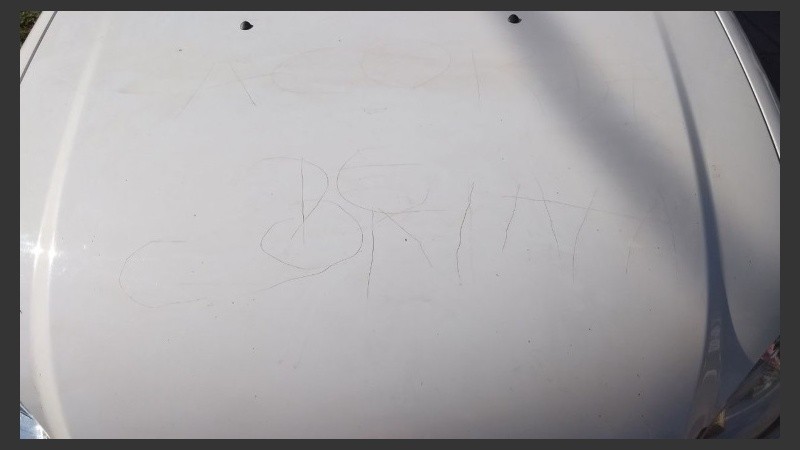 Este domingo, cerca de las 19, la docente Amanda González se encontró con que le habían rayado el capó de su vehículo particular con el mensaje "Acordate de Corina", en una clara alusión al secuestro y las torturas sufridas la semana pasada por su colega de Moreno.