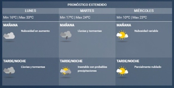 En cambio, este lunes comenzará a aumentar la nubosidad por la mañana y hacia la tarde o noche comenzarían a registrarse precipitaciones y tormentas luego de una máxima de 33 grados.