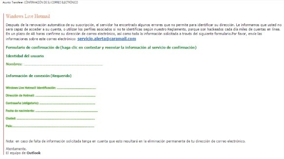 “Windows Live Hotmail. Después de la renovación automática de su suscripción, el servidor ha encontrado algunos errores que no permite para identificar su dirección. Le informamos que usted no será capaz de acceder a su cuenta, o utilizar los perfiles asociados si no te identificas según nuestro Reglamento, porque son hackeados cada día miles de cuentas en línea. En un plazo de 48 horas confirme su dirección de correo electrónico, así como toda la información solicitada a través del siguiente formulario.Por favor, envíe las informaciones sobre este correo electrónico: servicio.alerta@caramail.com. Formulario de confirmación de (haga clic en contestar y reenviar la información al servicio de confirmación)”.