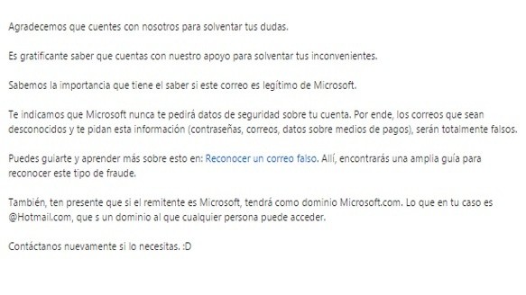 “...Microsoft nunca te pedirá datos de seguridad sobre tu cuenta. Por ende, los correos que sean desconocidos y te pidan esta información (contraseñas, correos, datos sobre medios de pagos), serán totalmente falsos. Puedes guiarte y aprender más sobre esto en: Reconocer un correo falso. Allí, encontrarás una amplia guía para reconocer este tipo de fraude. También, ten presente que si el remitente es Microsoft, tendrá como dominio Microsoft.com. Lo que en tu caso es @Hotmail.com, que es un dominio al que cualquier persona puede acceder”, dice textualmente la respuesta de la empresa.