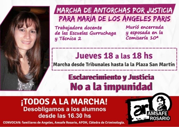 Los docentes de Rosario convocaron a una movilización para el próximo jueves para reclamar el esclarecimiento de la muerte de María de los Ángeles Paris, una bibliotecaria que falleció dentro de una comisaría en circunstancias aún poco claras. Se interrumpirán las clases por la tarde en las escuelas de la ciudad.