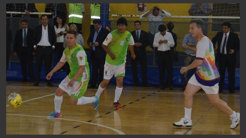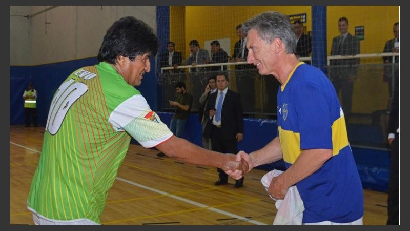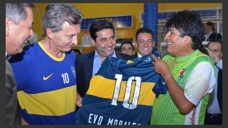 Con la camiseta de Boca y en las instalaciones del club que dirigió por años, el presidente electo Mauricio Macri jugó este miércoles al fútbol con el mandatario boliviano, Evo Morales, a sólo horas de asumir la jefatura de Estado.