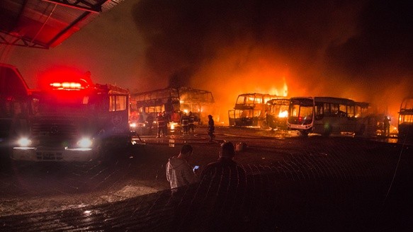 Mientras se registraba el incendio, que las cámaras de el Tres registraron en vivo, desde el galpón se escuchaban cada tanto explosiones, al parecer de los neumáticos de los micros alcanzados por las llamas.