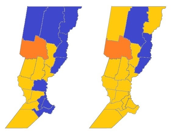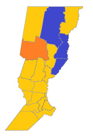 En el siguiente mapa de la provincia, pueden observarse pintados de color azul los departamentos donde ganó el Frente Justicialista; de color amarillo los de Cambiemos, y de anaranjado el del Frente Progresista.