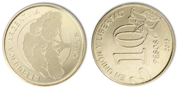En tanto, la moneda de diez pesos fue realizada de alpaca homogénea y es dorada. Mide 24,5 milímetros de diámetro y pesa 9 gramos. En su anverso tiene la representación del caldén y en su reverso la flor y hojas del árbol.