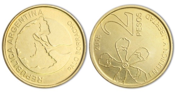 La moneda de dos pesos tiene un aspecto dorado y fue hecha con acero electrodepositado con latón. Mide 21,5 milímetros de diámetro y pesa 5 gramos. En su reverso tiene una síntesis de la flor del palo borracho y se puede leer "En unión y libertad", en la parte superior se ubica la imagen completa del árbol.