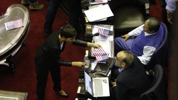 Pero ésta no fue la única intervención que dio color a la sesión del Presupuesto. La diputada Mayra Mendoza, junto a otros legisladores, repartió banderas de Estados Unidos.