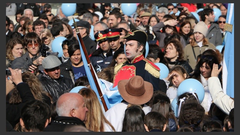 El acto del Día de la Bandera tuvo momentos emotivos que endulzaron el costado protocolar de la ceremonia. Primero, apareció “Belgrano” para la sorpresa de los niños y niñas que fueron al Monumento a jurarle lealtad a la bandera. Después, un hombre amarrado a la torre central, descendió caminando con una bandera en la mano. El final fue con una suelta de globos celestes y blancos.