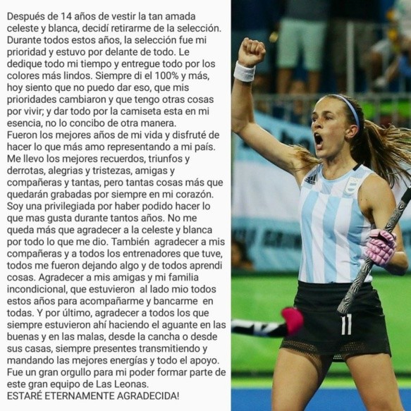 La decisión la toma a sus 32 años, sintiéndose "una privilegiada por haber podido hacer lo que más me gusta", recordando que desde 2003 formaba parte del plantel del seleccionado de hockey.