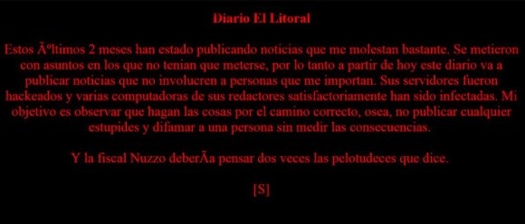 En el ataque al sitio web del diario El Litoral de Santa Fe se intimidó también a la fiscal María Lucila Nuzzo, quien tiene a su cargo la investigación de estafas con tarjetas de créditos. En aquel momento, el Ministerio Público de la Acusación (MPA) expresó su respaldo a la funcionaria amenazada.