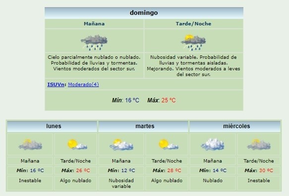 El Servicio Meteorológico Nacional (SMN) anuncia para lo que resta de este domingo probabilidad de lluvias y tormentas aisladas con vientos moderados a leves del sector sur. Mejorando.