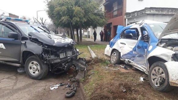 Desde la guardia de Bomberos, Walter Barbieri dijo a la FM DaLe!: “El siniestro involucró a dos móviles policiales, una camioneta Chevrolet S10 que circulaba por calle Moreno, que impactó a un VW Voyage que iba por Agüero”.