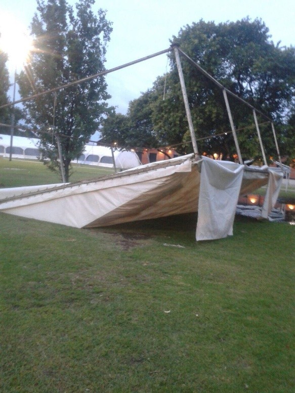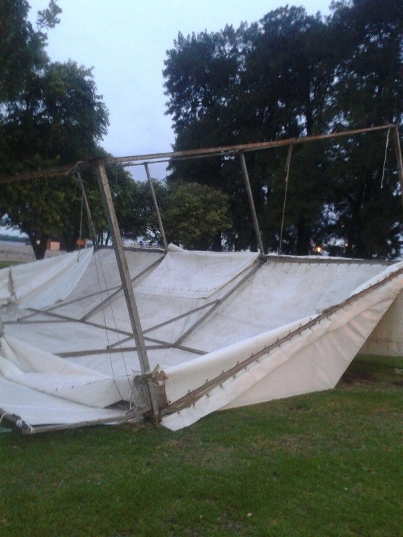 Si fue una maldición gitana, se equivocó de fecha. Porque si bien la tormenta de este viernes a la madrugada produjo daños, no fueron tantos y hay tiempo de dejarlos atrás. Es que los vientos de más de 90 kilómetros por hora volaron algunas carpas que ya se armaron para Fiesta de las Colectividades.