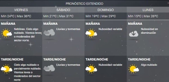 De acuerdo al SMN, la ola de calor se mantendrá al menos hasta el viernes, con una mínima prevista en 24 grados y una máxima de 36, con cielo algo nublado. Un poco de alivio llegaría el sábado si se cumple el pronóstico de lluvias y tormentas durante todo el día, aunque el termómetro podría continuar superando la barrera de los 30 grados.