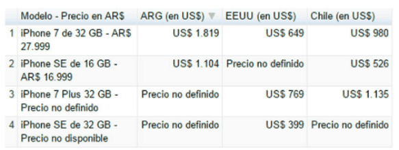 De no tener en cuenta lo antes mencionado, el modelo iPhone 7 de 32 GB que en los Estados Unidos cuesta u$s649; al ingresar al país hay que declarar el equipo y abonar de forma adicional uno u$s174,5 en la Aduana de AFIP. De esta forma, el precio final es de u$s823,5, sin contar el pasaje y la estadía.