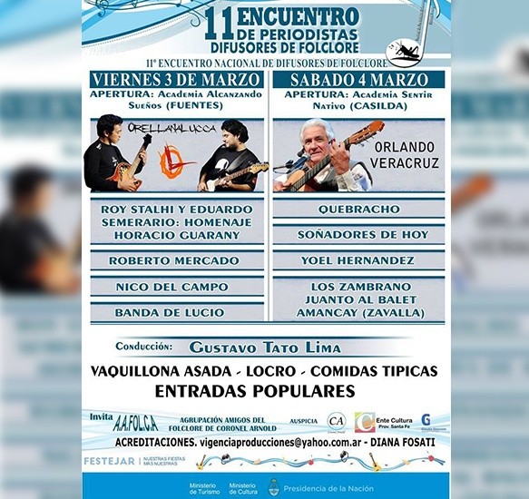 Se realizará este viernes y sábado la edición 11º del Encuentro Nacional de Difusores de Folclore en la pequeña localidad santafesina de Coronel Arnold. Periodistas y difusores especializados del género musical se juntarán con el objeto de debatir, charlar y consensuar nuevas estrategias de comunicación de nuestras costumbres y de la música popular argentina. Habrá dos noches a pura música en vivo con artistas consagrados.