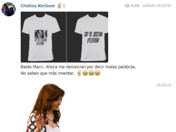 "Basta Macri. Ahora me denuncian por decir malas palabras. No saben que más inventar", afirmó la ex presidenta, quien publicó una remera con su rostro y la frase: "Soy yo, Cristina, ¡pelotudo!".