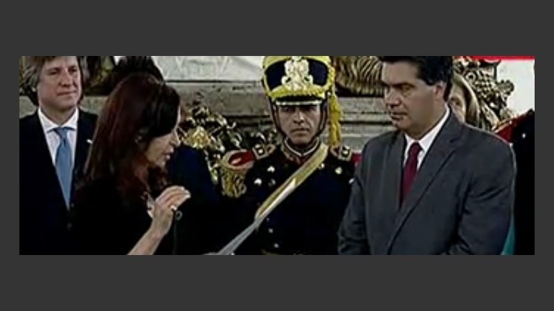 El primero en jurar fue Jorge Capitanich como jefe de Gabinete, y lo hizo por la patria y los santos evangelios. Axel Kicillof, nuevo ministro de Economía, se mostró muy sonriente, sólo juró por la patria y después le dijo a Cristina: "Gracias presidenta". Carlos Casamiquela fue el tercero en cumplir la formalidad y se convirtió en titular de Agricultura.
