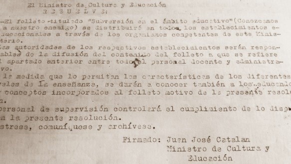 En ese marco, en octubre del 77, llegó a las escuelas y universidades un documento de 31 páginas titulado “Subversión en el ámbito educativo (Conozcamos a nuestro enemigo)” que a pesar de llevar la firma del entonces ministro de Cultura y Educación Juan José Catalán, fue conocido como el “Informe Díaz Bessone”, porque, según se decía, había sido redactado por quien ejercía en aquellos días el cargo de ministro de Planeamiento, Ramón Díaz Bessone.