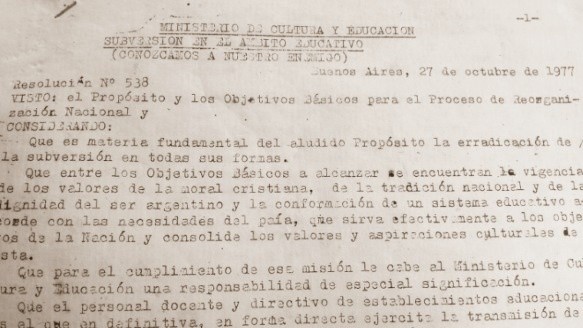 La educación es una poderosa herramienta de transformación, pero también puede ser un medio de ordenamiento y subordinación, según los fundamentos y valores que la guían. El llamado Proceso de Reorganización Nacional que avanzó sobre todas las instituciones, en especial las escuelas, a partir del 24 de marzo de 1976 lo sabía muy bien. Por eso, apenas las Fuerzas Armadas tomaron el poder, comenzaron a llegar a las escuelas las circulares con disposiciones de claro contenido ideológico y cumplimiento obligatorio. Antes de bajarle el pulgar al trabajo grupal y a la teoría de conjunto, las órdenes apuntaron a alinear ideológicamente a directivos, profesores y maestros. A infundir miedo, a vigilar a través de infiltrados y a castigar con cesantías y/o delaciones.