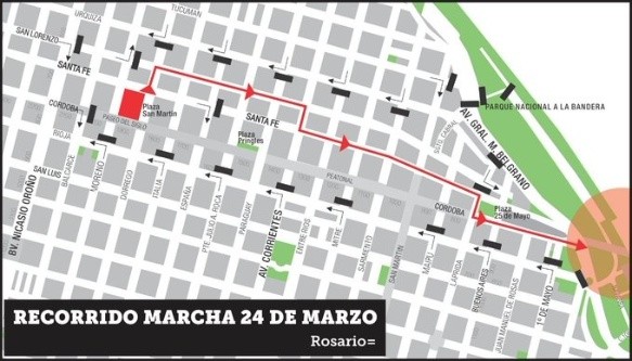 La movilización convocada por el espacio Juicio y Castigo Rosario (fundado por Madres de plaza 25 de Mayo, Abuelas, Familiares de desaparecidos, APDH e Hijos, entre otros), partió desde la esquina de Dorrego y Santa Fe hacia San Lorenzo, y desde ahí el recorrido fue por San Lorenzo, Corrientes, Santa Fe, Buenos Aires y Córdoba hasta el Monumento.