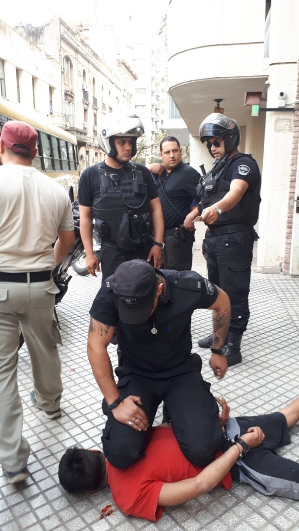 La mujer añadió que el grupo de uniformados reaccionó de manera violenta: no sólo lo esposaron sino que además lo golpearon, y un policía sin identificación lo mantuvo a los rodillazos con la cabeza contra la acera antes del traslado a la comisaría 2ª.