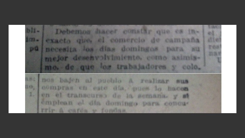 Quizás lo más llamativo del salto temporal es la repetición de los argumentos, aunque con algunos matices: los empleados de comercios aseguraban en junio de 1915 que el cierre los días domingos no afecta al rubro y tampoco a los habitantes, que podían hacer sus compras en la semana. Dicen: “Debemos hacer constar que es inexacto que el comercio de campaña necesita los días domingos para su mejor desenvolvimiento como asimismo de que los trabajadores y colonos bajen al pueblo a realizar sus compras en este día, pues lo hacen en el transcurso de la semana, y sí emplean el día domingo para concurrir a cafés y fondas”.